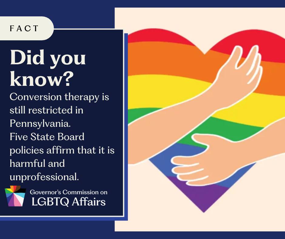 In the recent Facebook post referenced above, The Governor’s Commission on LGBTQ Affairs posted a photo reminding people that conversion therapy is still restricted and deemed a harmful and unprofessional practice, and a quote from Governor Shapiro.